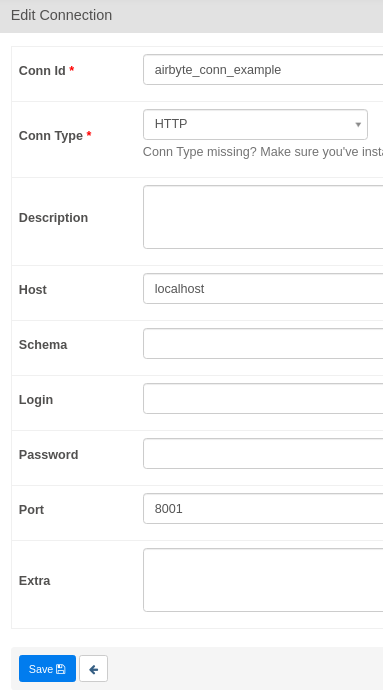Airflow will use the Airbyte API to execute our actions. The Airbyte API uses HTTP, so we'll need to create a HTTP Connection. Airbyte is typically hosted at localhost:8001